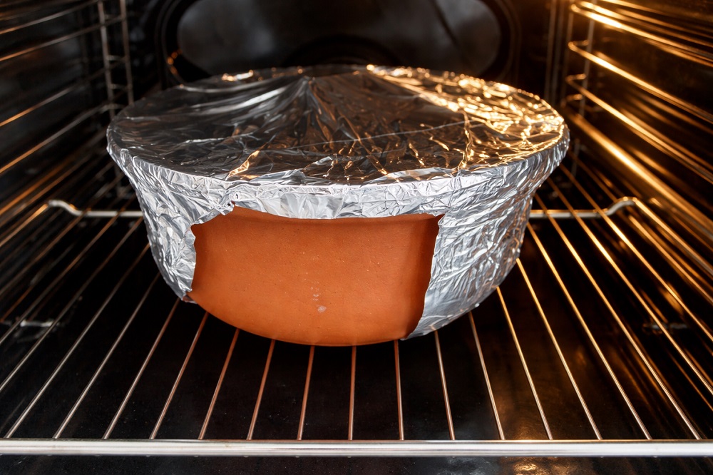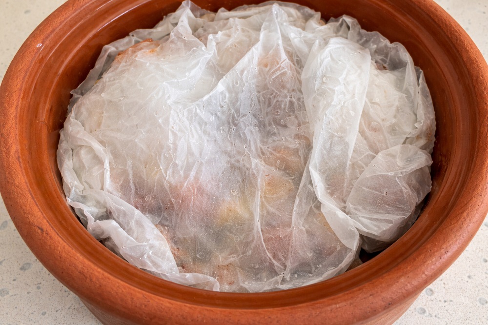 Ако гювечът има капак, използвайте го. Ако не – фолио или двойна хартия за печене ще задържат парата и ще осигурят равномерно готвене.