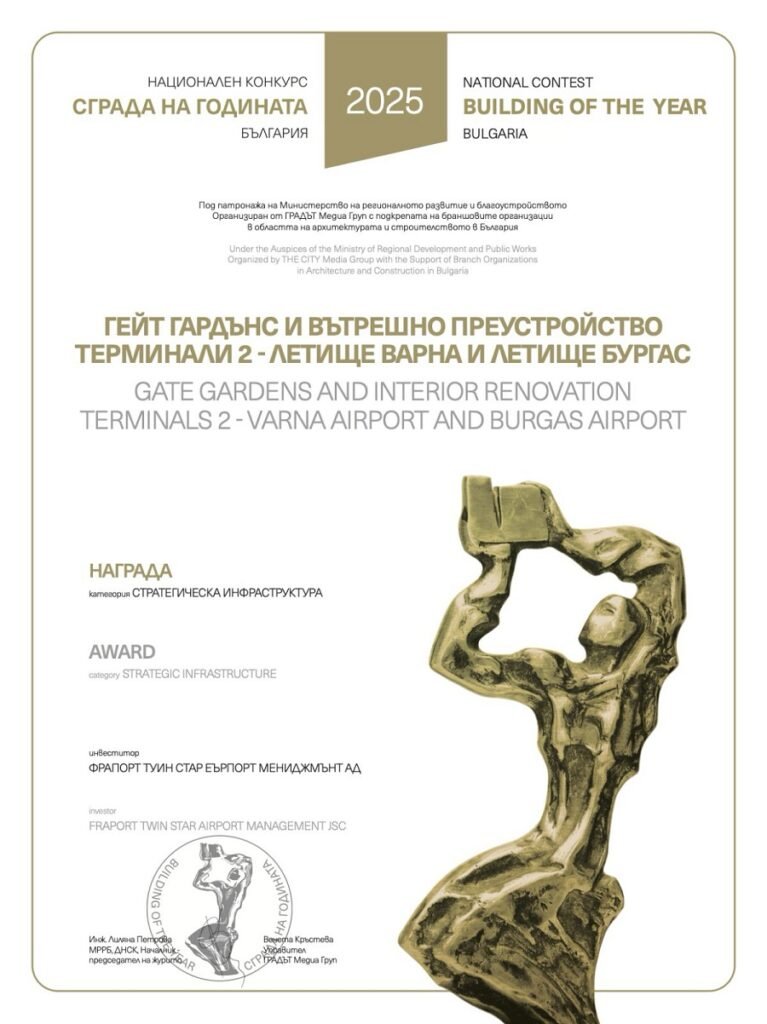 Наградата „Сграда на годината“ 2025 затвърждава позицията на „Gate Gardens“ като емблематичен инфраструктурен проект, който поставя Летище Варна и Летище Бургас сред водещите европейски примери за иновативни, устойчиви и ориентирани към пътника летищни терминали.
