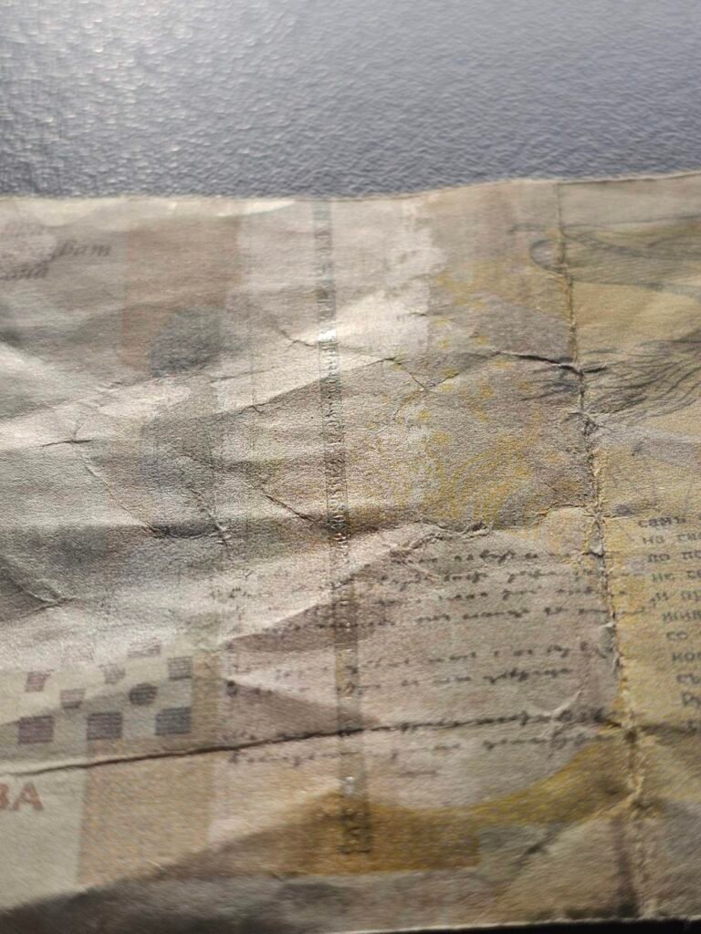 ✅ Еднакво усещане като обикновена хартия. Видими следи от преждевременно бързо износване на хартията в местата на прегъване (останалата част от банкнотата е видимо нова, но в мястото на прегъване е много захабена и/или се вижда бяла хартия отдолу). Истинските банкноти са изработени от специална памучна хартия и са изключително издръжливи, проектирани са с идеята, че ще бъдат прегъвани хиляди пъти.