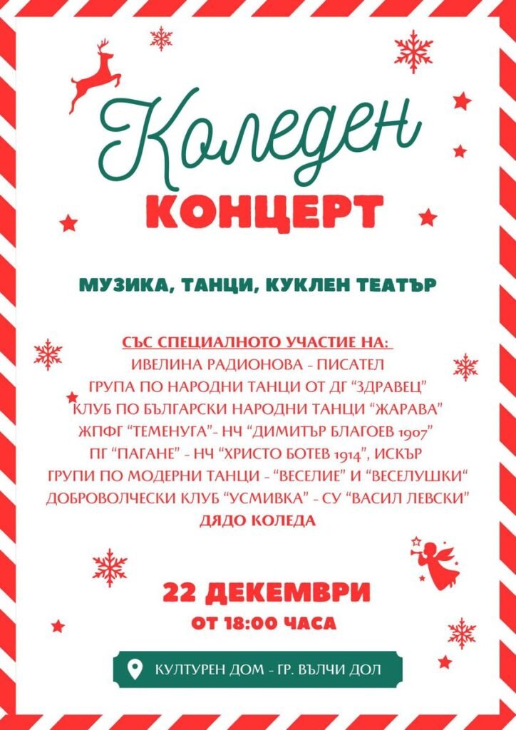 Заповядайте на 22 декември (петък) от 18:00 ч. в зрителната зала на Културен дом – гр. Вълчи дол, за да станете свидетели на ентусиазма и желанието на всички малки и големи учатници да ви зарадват!”, написа кметът на Вълчи дол.
