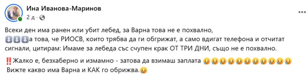 От публикацията на Ина Иванова става ясно, че от РИОСВ три дни подред са получавали сигнали за бедстващите красиви бели птици, но само са отчитали сигналите и те не са насочени към Спасителния център. Така гражданите не могат без надлежния протокол да отведат ранено или агонизиращо животно и потърсят съдействие в зоопарка.