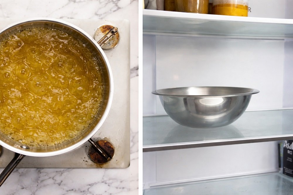 - Оставете да къкри ~3 минути до консистенция на рядък мед. Първоначално ще се сгъсти повече, след минута ще се отпусне. Имайте предвид, че при охлаждане се сгъстява допълнително. Дръжте топло.