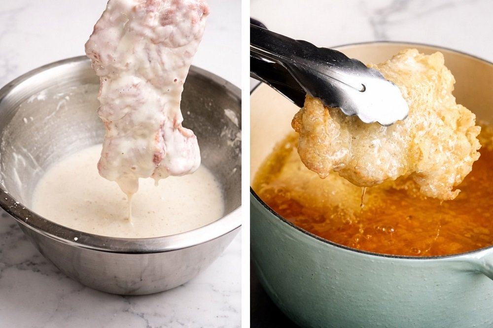 - Точно преди пържене добавете ледено студената сода към сухата смес и разбъркайте до гъста, но течлива панировка (покрива добре, леко полупрозрачна).