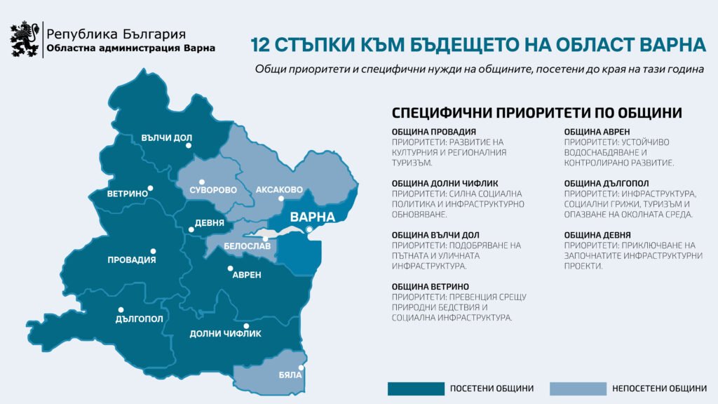 Инициативата „12 стъпки към бъдещето на област Варна“ ще продължи и в останалите общини още в началото на новата година, като целта е да бъде изготвена ясна и реалистична карта на приоритетите и нуждите на региона, върху която държавната и местната власт да работят съвместно през 2026 година.