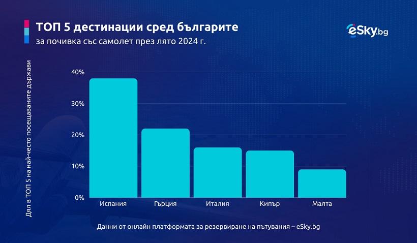 Хитът на летните почивки тази година е Испания – 38% от българите, пътуващи с eSky.bg, са организирали почивката си в тази южноевропейска страна. Сред най-предпочитаните са Коста Брава (Барселона, Лорет де Мар, Малграт де Мар), Коста Бланка (Аликанте, Валенсия) и Майорка (Палма и Манакор). В Лорет де Мар сънародниците ни тази година са платили най-малко за пакет за почивка – малко под 280 € на човек за 6 дни. За разлика от тях, 8-дневно пътуване в островната част на страната е по-скъпо – 510 €.
