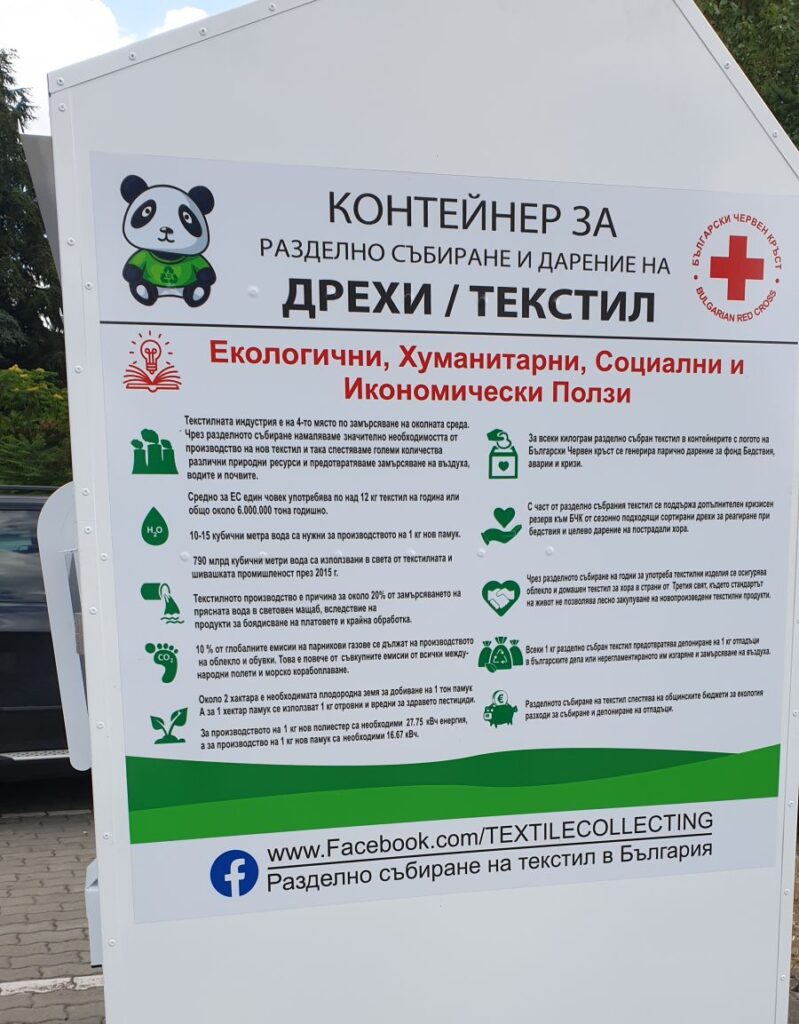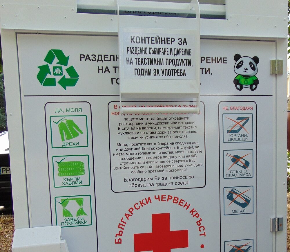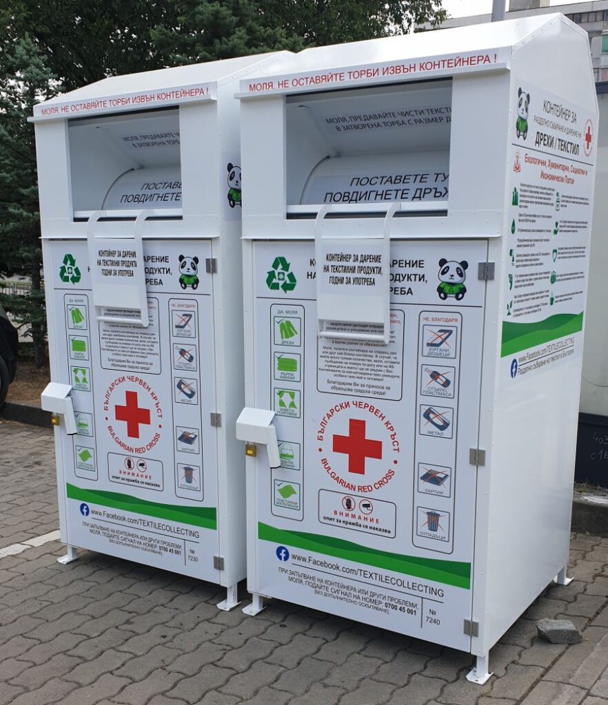 Също така, Българският червен кръст (БЧК) поддържа собствени контейнери с логото на организацията. Събраният текстил се транспортира до специализирана фабрика, където се сортира, преработва или подготвя за повторна употреба. За всеки предаден килограм се отчисляват средства в полза на фонда на БЧК.