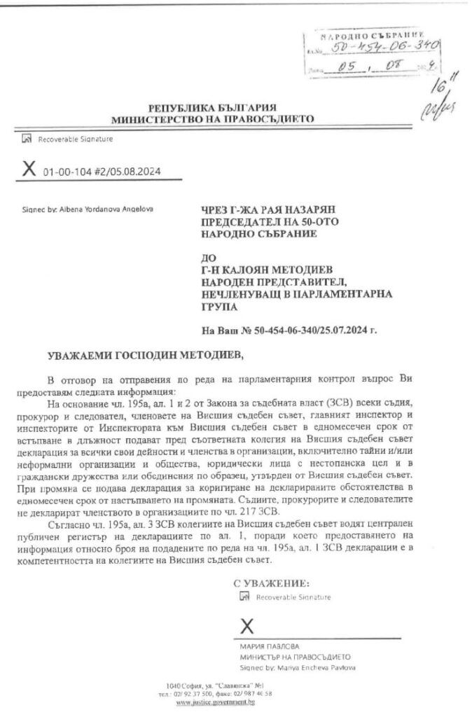 С този парламентарен въпрос относно декларирането на дейности в тайни неформални организации и общества, неправителствени организации в съдебната система независимият народен представител Калоян Методиев се обърна към служебния правосъден министър Мария Павлова.
