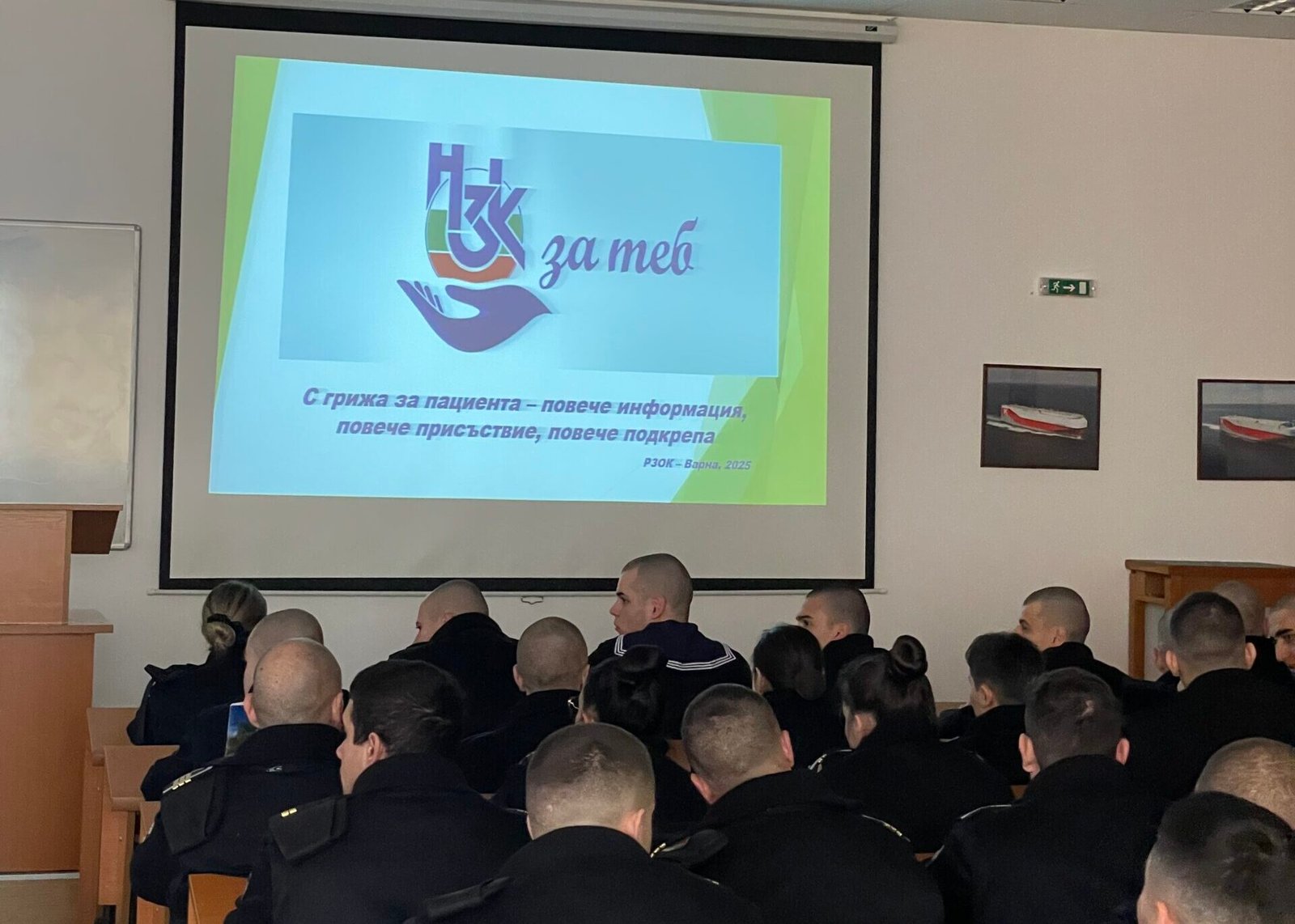 В сериозен и задълбочен разговор – дискусия по въпросите на здравеопазването се превърна срещата на експерти от РЗОК – Варна, с курсанти от Висшето военноморско училище „Н. Й. Вапцаров“. Инициативата бе в рамките на националната кампания „НЗОК за теб“, която има за цел да достигне до повече здравноосигурени потребители и да разясни правата и задълженията им.