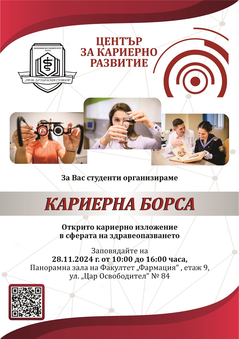 Центърът за кариерно развитие (ЦКР) на МУ -​ Варна кани всички студенти от университета на „Кариерна борса 2024“ – открито изложение в сферата на здравеопазването. Събитието ще се проведе на 28.11.2024 г. от 10:00 до 16:00 часа в сградата на Факултет „Фармация“ на бул. „Цар Освободител“ № 84.