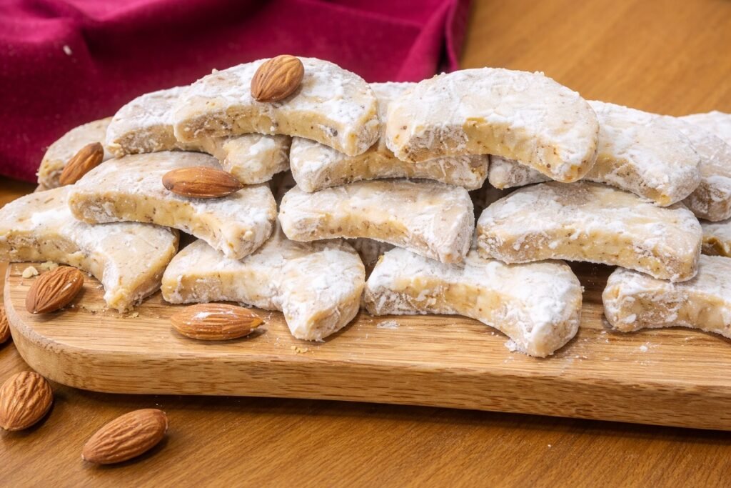 Кавалските курабии са едни от най-ароматните и дълготрайни сладки на Балканите – приготвени с масло, запечено брашно и много бадеми. Без яйца и мляко, с фина ронлива текстура и характерна форма на полумесец, тези курабии са идеални за празници, подарък или следобеден чай. Представяме ви автентична рецепта за кавалски курабии, която винаги се получава.