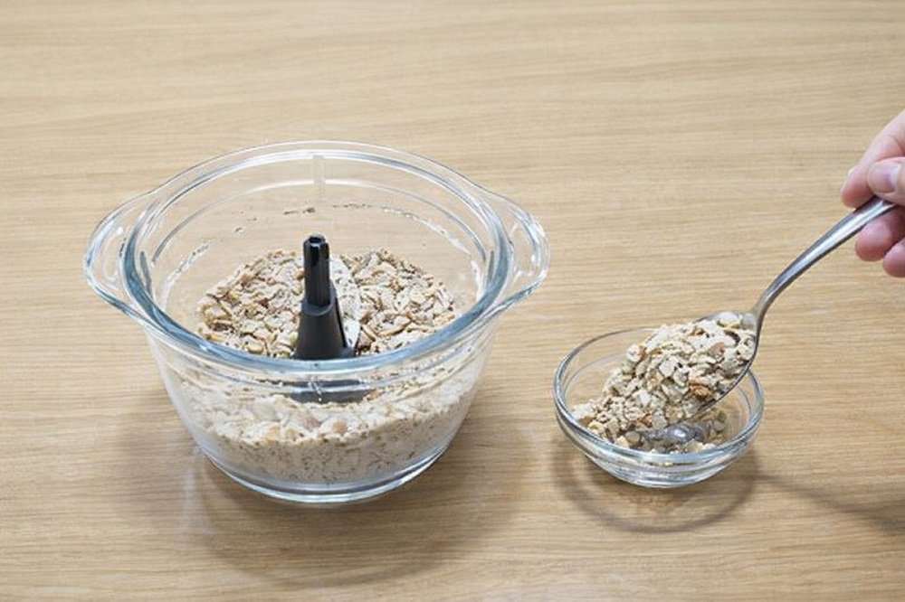 Смелете суровите бадеми в чопър на 1–2 кратки пулса, докато станат леко едри. Отделете 2–3 с.л. от тях. Останалите смелете до фино брашно.