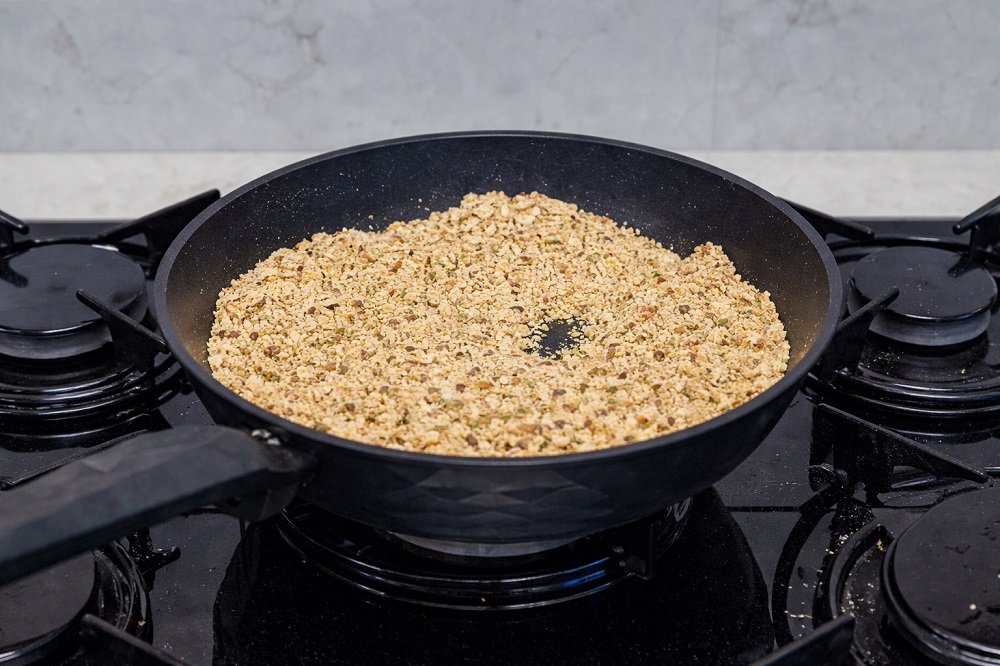 В сух тиган на слаб огън запечете 1 ч.ч. брашно заедно със смлените бадеми, докато леко променят цвета си и пуснат аромат. Оставете сместа да изстине напълно.