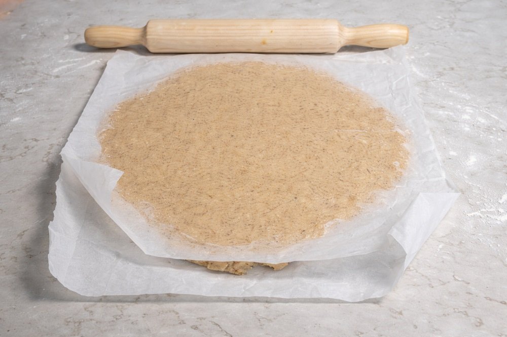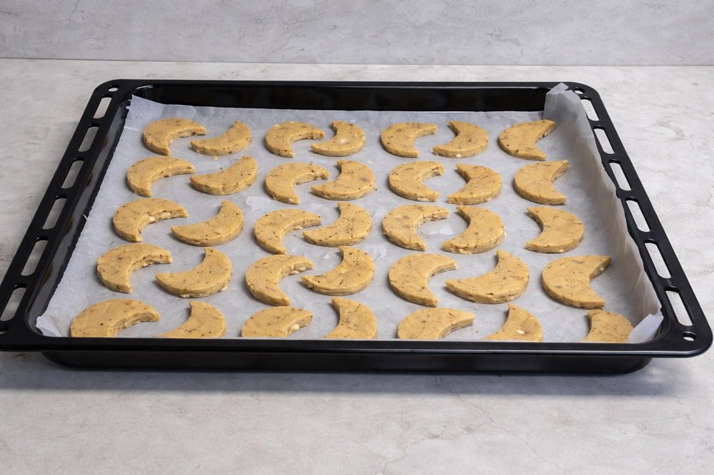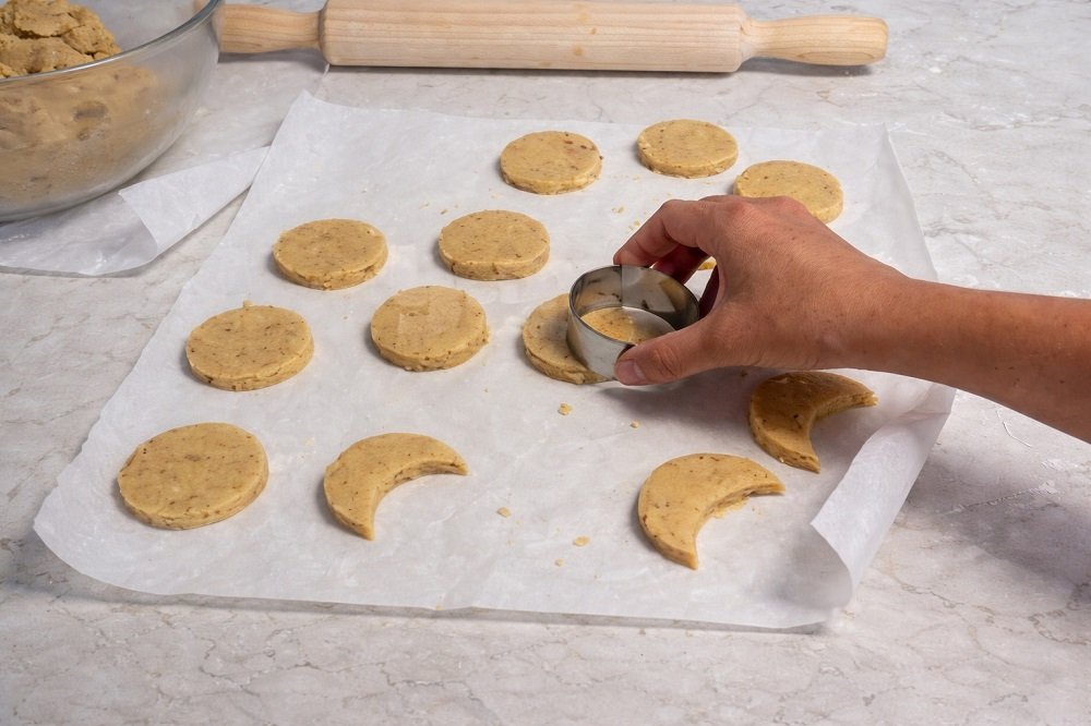 Разточете тестото между два листа хартия за печене до дебелина около 1 пръст. С форма или чаша изрежете курабии във форма на полумесец.