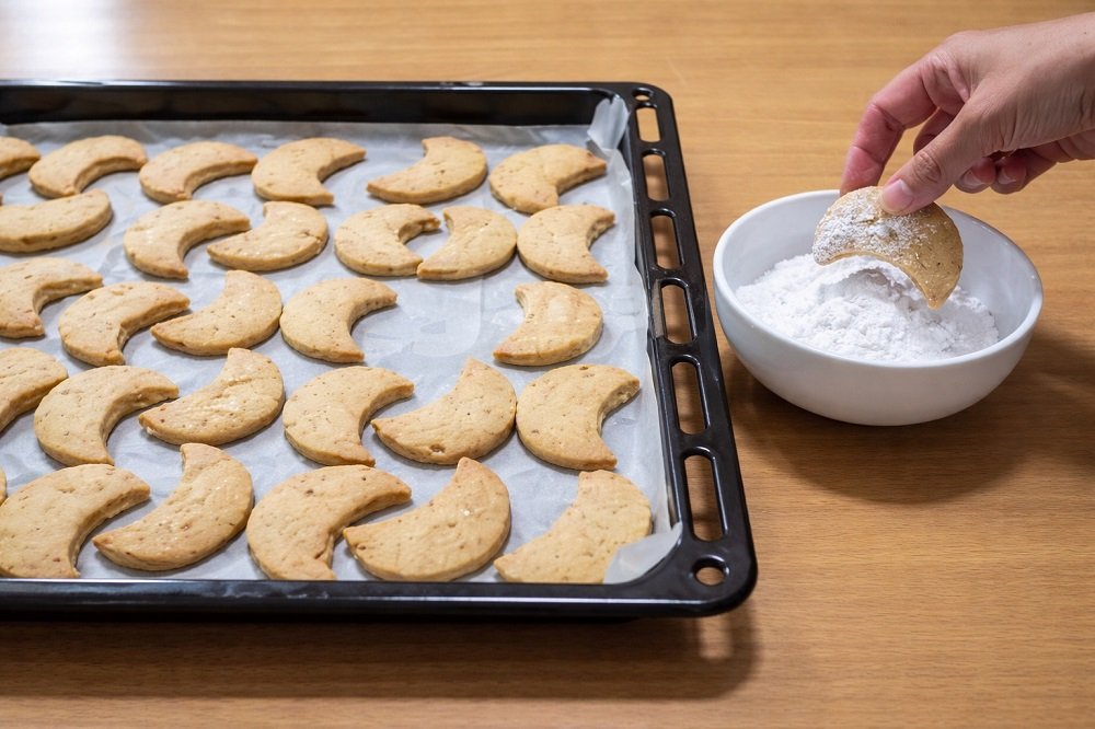 Оставете курабиите да изстинат напълно, след което ги оваляйте обилно в пудра захар.