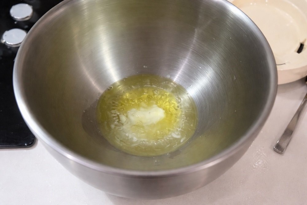 - В купа смесете всички съставки без брашното – масло, олио, сол, пудра захар, кисело мляко и оцет.
