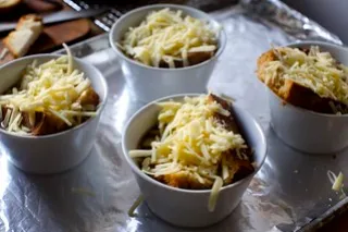 В български условия можем да я приготвим със зеленчуков или пилешки бульон, а за завършек да използваме кашкавал или добре узряло жълто сирене вместо класическото „Gruyère“.