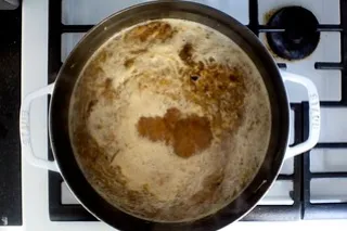 - Деглазирайте с бялото вино (или ракия), оставете алкохолът да се изпари.