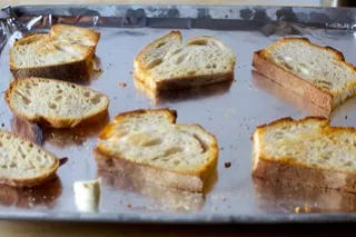 - Междувременно нарежете багетата на филийки, препечете ги във фурната и настържете върху тях кашкавала.