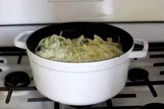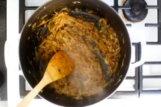 - В голяма тенджера загрейте маслото и зехтина. Добавете лука и захарта. Запържете на умерен огън, като разбърквате често, докато лукът стане златисто-карамелен (около 35–40 минути).