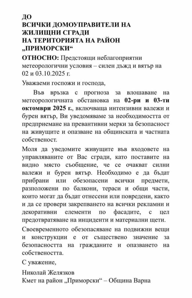 Кметът на район „Приморски“ във Варна Николай Желязков разпространи официално предупреждение към домоуправителите на жилищни сгради заради очаквано влошаване на метеорологичната обстановка на 2 и 3 октомври 2025 г.
