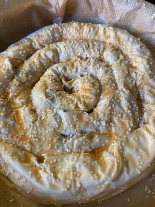 Основната тънкост при работа с фини кори (фило) е те да се държат под леко влажна кърпа, за да не изсъхват. Винаги работете с една кора наведнъж, когато оформяте спиралата.