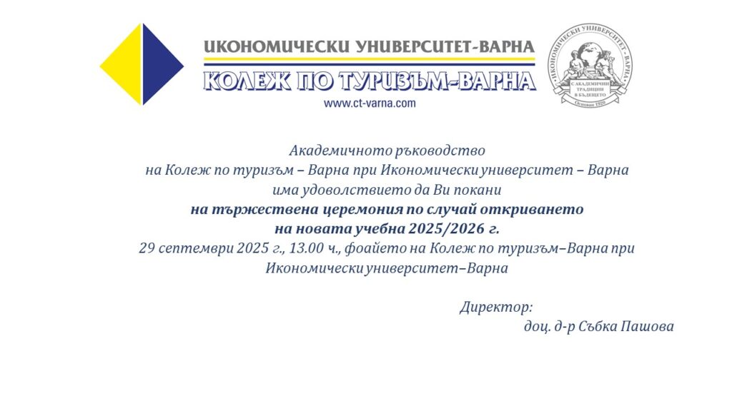 На 29 септември 2025 г. Колежът по туризъм към Икономически университет – Варна ще даде официален старт на учебната 2025/2026 година. Тържествената церемония ще се състои от 13:00 ч. в двора на III корпус на университета, бул. „Сливница“ 158 А.