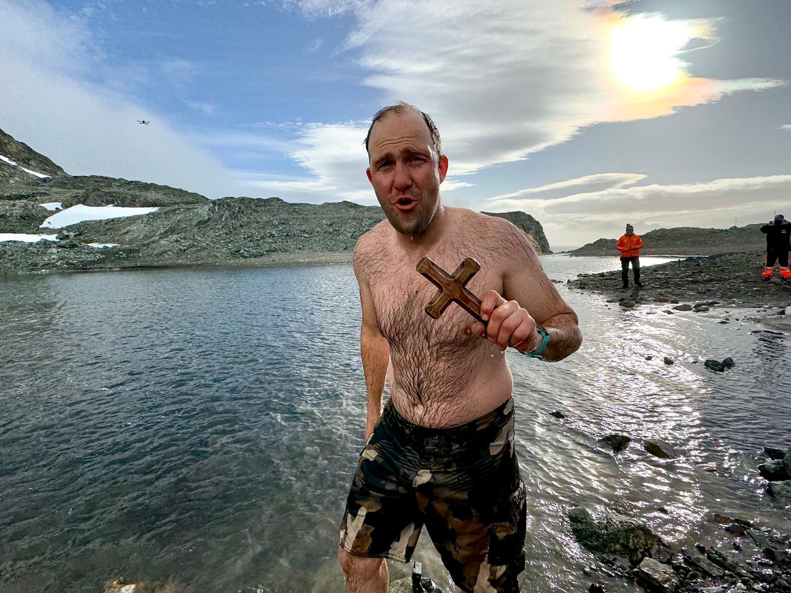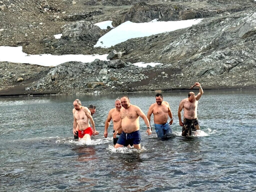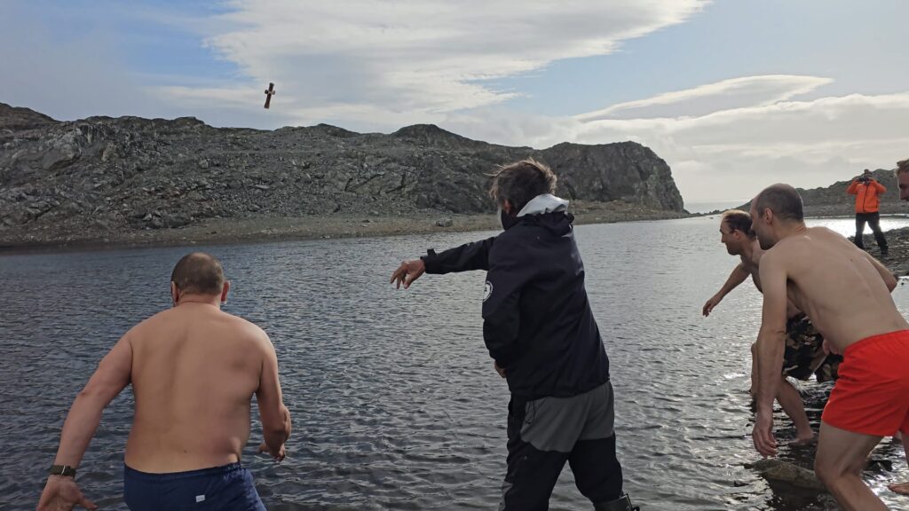 Във водата смело скочиха Александър Богдев, Петър Сапунджиев, Влади Гигов, Камен Недков, Георги Вълчанов и Росен Стефанов, а кръста хвърли един от доайените в експедицията – физикът Васил Гурев. Първи до кръста стигна командирът на българската база “Св. Климент Охридски” на остров Ливингстън от Южните Шетлендски острови в Антарктида- Камен Недков.
