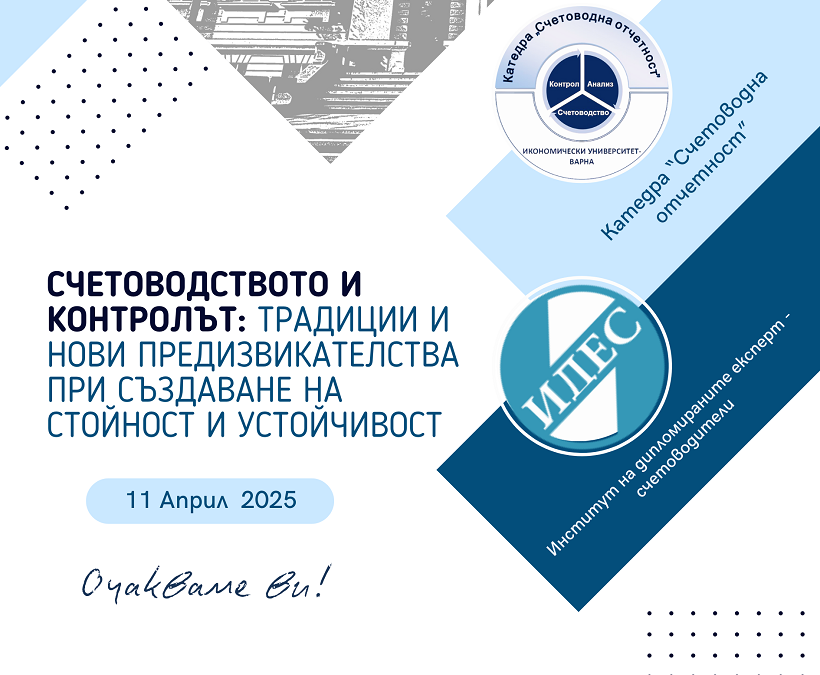 Катедра “Счетоводна отчетност” при Икономически университет – Варна с партньорството на Регионалната организация на Института на дипломираните експерт-счетоводители (ИДЕС) във Варна организира Международна научно-практическа конференция на тема “Счетоводството и контролът: традиции и нови предизвикателства при създаване на стойност и устойчивост”. Форумът е посветен на 105-годишнината от въвеждането на счетоводни дисциплини с първата учебна програма на Висшето търговско училище – Варна, чийто правоприемник е Икономически университет – Варна. Конференцията ще се проведе в хибриден формат – присъствено и онлайн, на 11 април 2025 г. в зала 1 на Икономически университет – Варна и ще бъде открита в 9:30 ч.