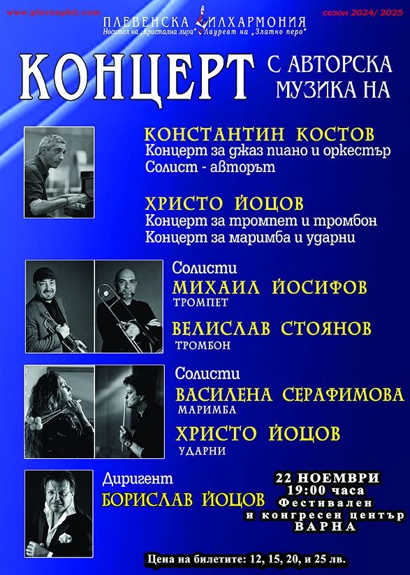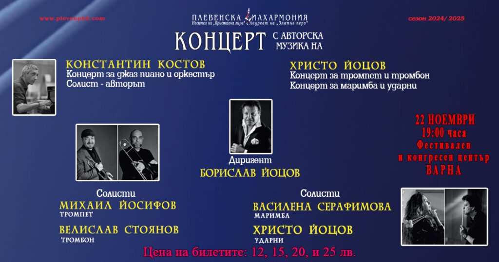 На 22-ри ноември, петък, от 19:00 часа във Фестивален и конгресен център – Варна, Плевенската филхармония ще представи концерт с авторски творби на границата между класиката и джаз музиката на Константин Костов и Христо Йоцов. Ще прозвучат три изключително любопитни и красиви произведения с джаз теми в симфоничен аранжимент, премиерно за Варна, под диригентската палка на маестро Борислав Йоцов.