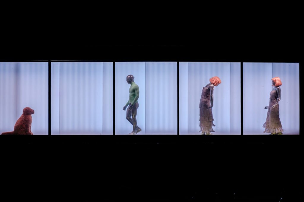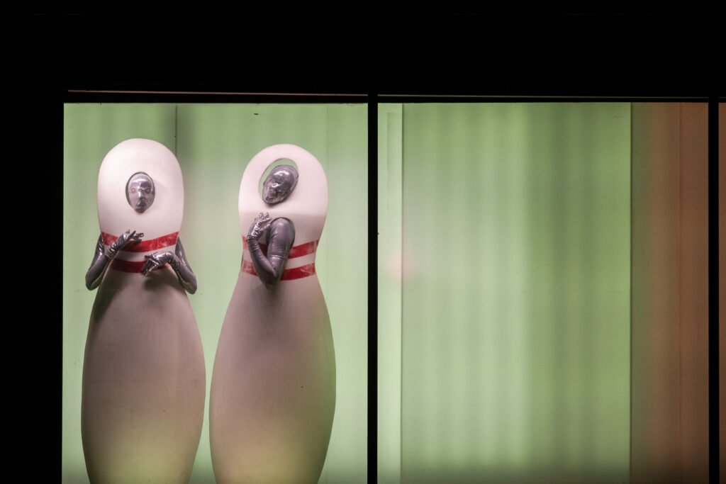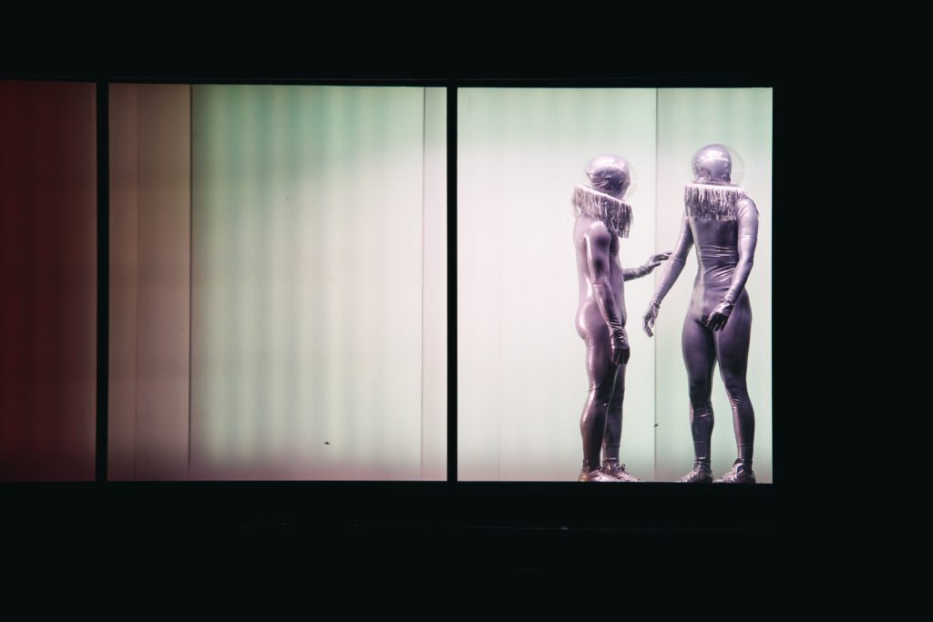 Действието се развива вътре и върху 12-метров контейнер на ремаркето на ТИР. Щом стените се отворят, публиката се среща с чудати същества в сребристи костюми – „пришълци“, които се опитват да усвоят човешките навици. На пода на контейнера е монтирана конвейерна лента, по която се движат хуманоидите и декорът, а хореографията се разгръща с плавни, градиращи движения.
