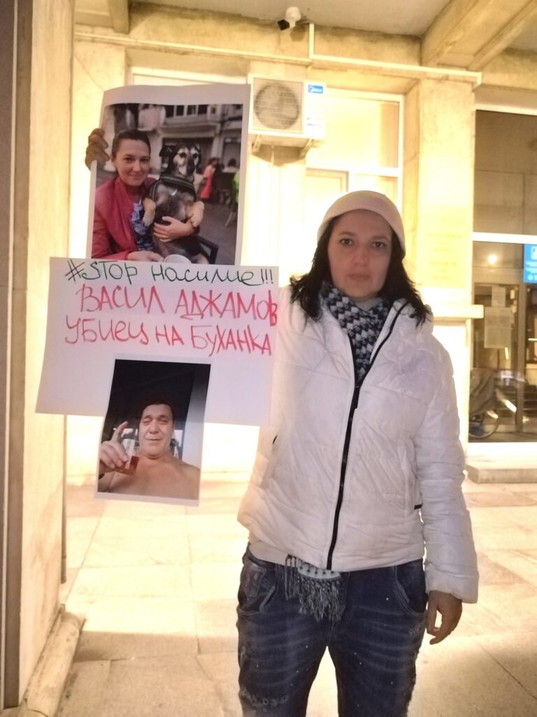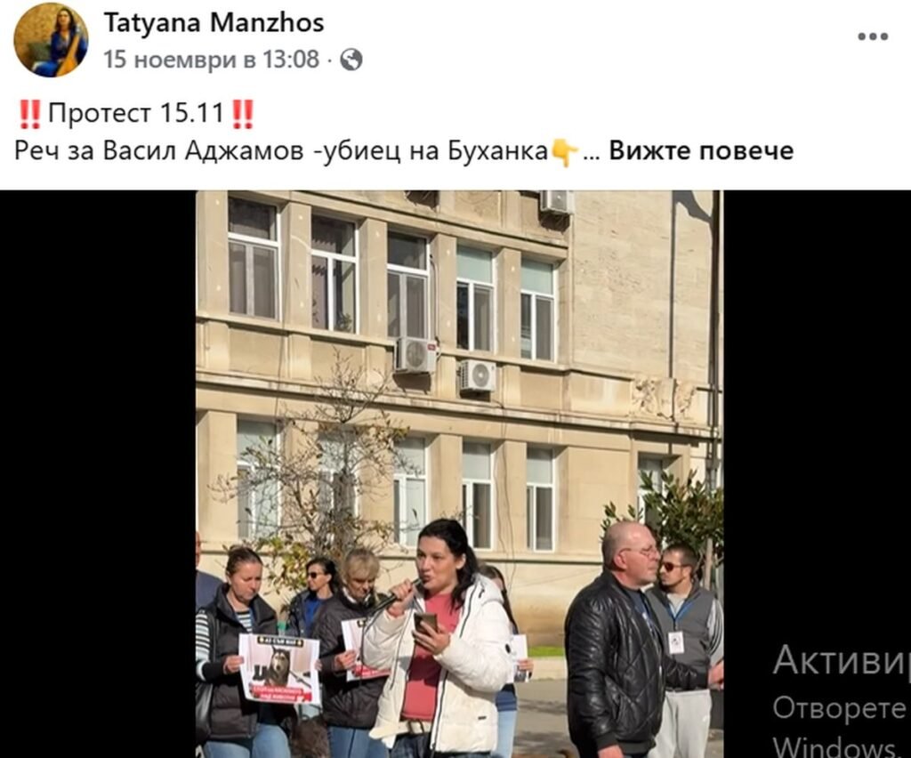 “Казвам се Татяна. Моето куче, Буханка, беше убито от три питбула, собственост на този изрод Васил Аджамов. Престъпникът, когото виждате, държеше ръцете на моя съпруг, за да не може той да защити нашето куче от трите питбула. Тогава съпругът ми прикри с тялото си кучето, рискувайки да бъде ухапан в артерията, докато лежеше на земята.