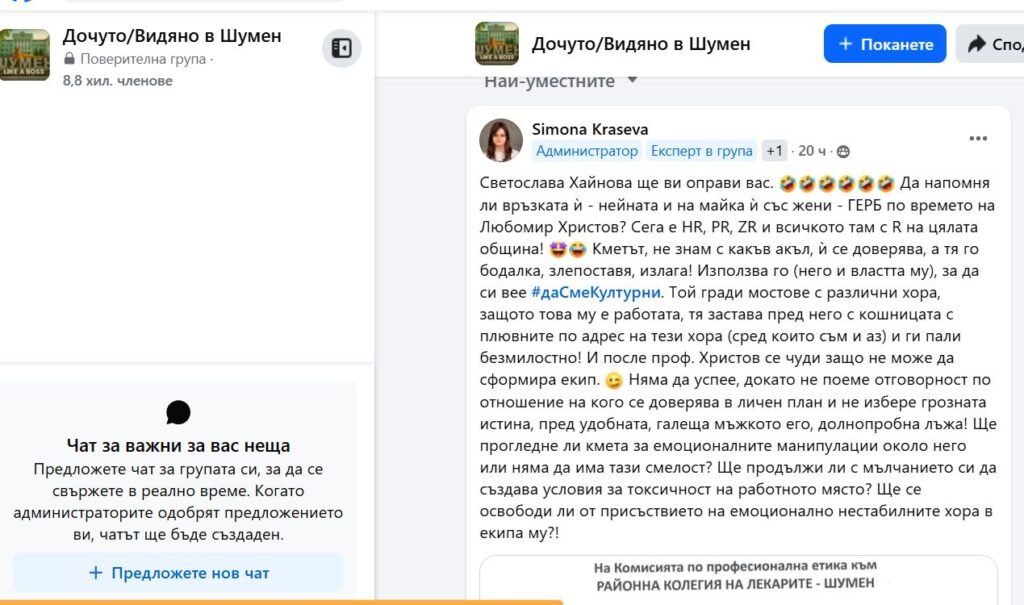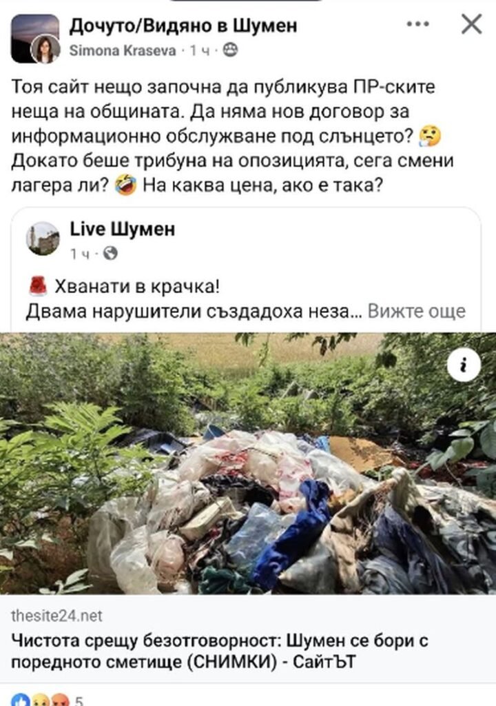 В същото време Красева гадае дали СайтЪТ не е “обърнал” политиката на “опозиционна” медия и не се е “продал” на настоящото ръководство, защото публикува и информация за акции на община Шумен относно чистота и ред. Ако имаше дори малко медиен опит, младата дама щеше да знае, че една медия е длъжна да информира своите читатели за всичко – хубаво и лошо по обективен начин, но пък интригите са характерни за всеки хейтър, който гони популярност и последователи. Както се казва: “Крадецът вика – дръжте крадеца!”