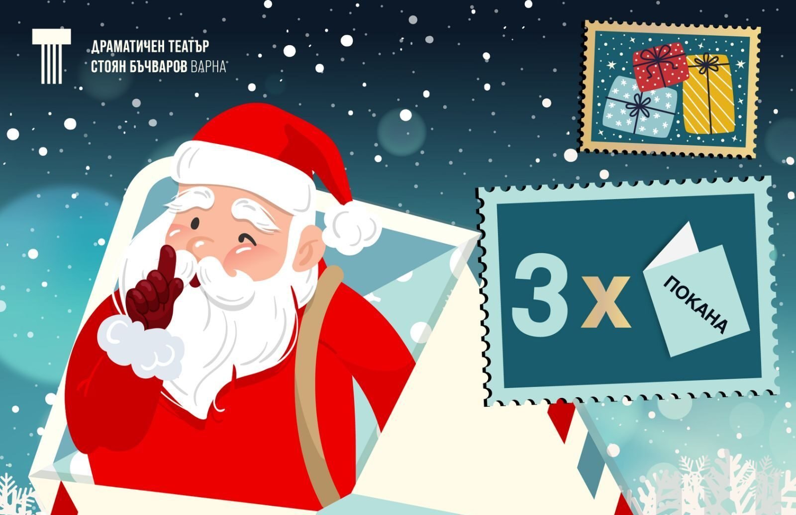 На 22 декември, след последното за сезона празнично представление, от театъра ще изтеглят три писма. Техните автори ще получат двойни покани за спектакъла „Сън“, който ще се играе през януари. За деца под 14-годишна възраст е необходимо върху плика да бъде изписано и името на родител.