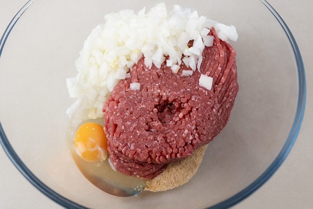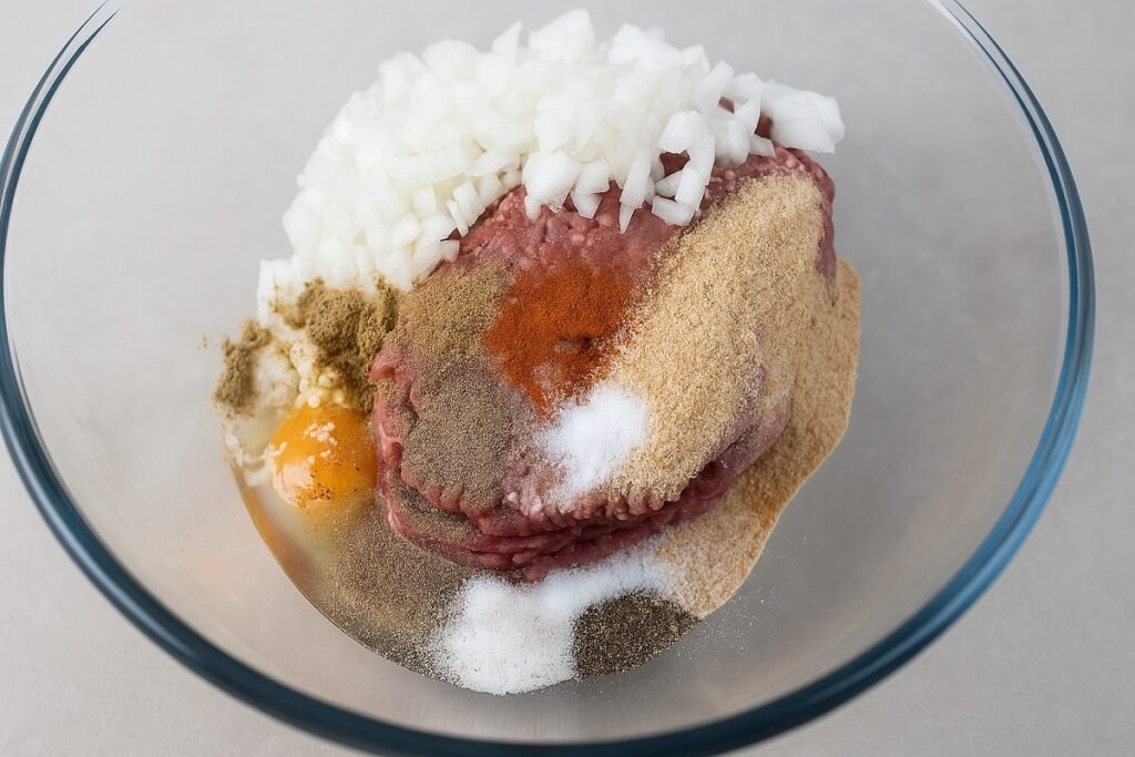 Смесете каймата, лука, чесъна и яйцето. Добавете галетата и подправките. Омесете добре, докато получите еднородна смес.