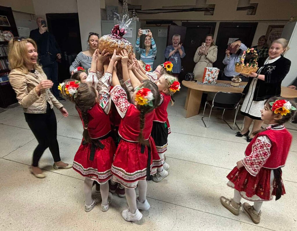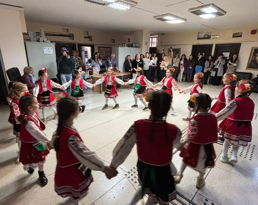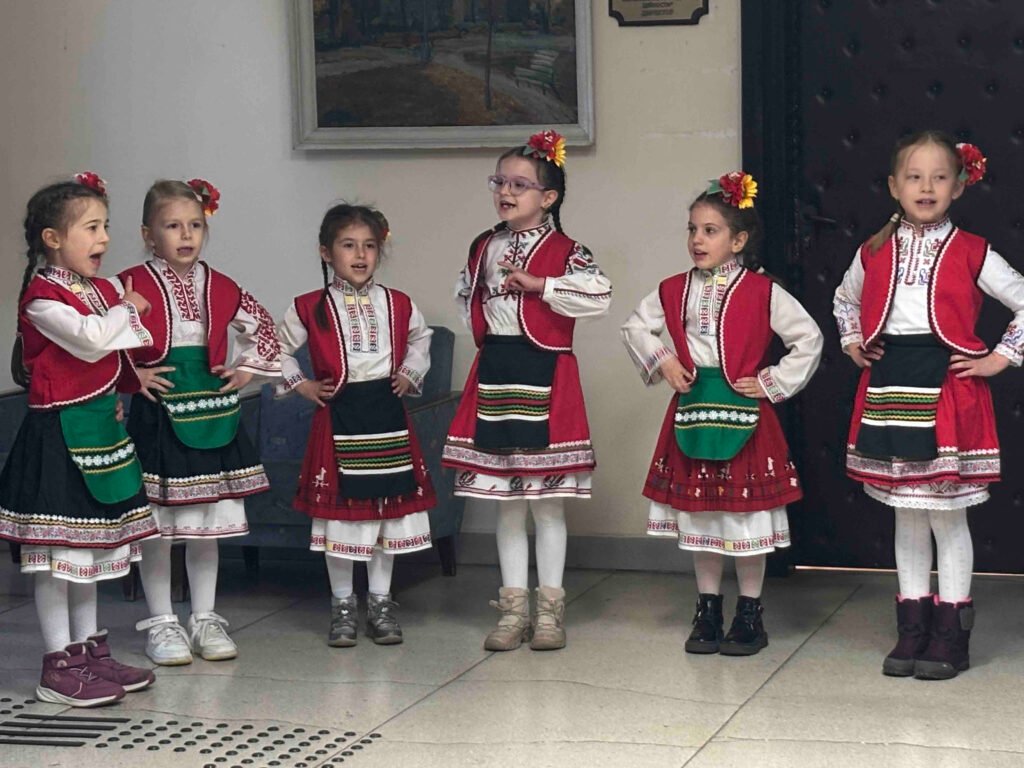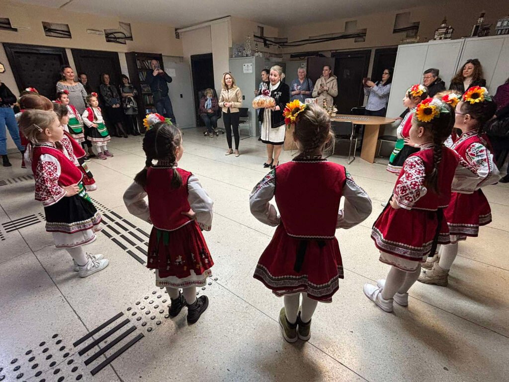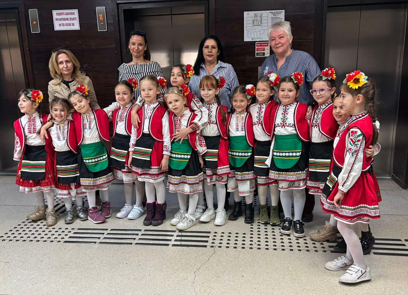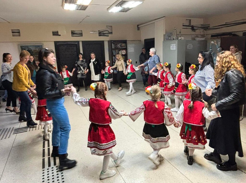 Облечени в автентични носии и закичени с цветя, децата пяха, танцуваха традиционните за празника пролетни танци и поканиха екипа на дирекция „Образование и младежки дейности“ на кръшно българско хоро.