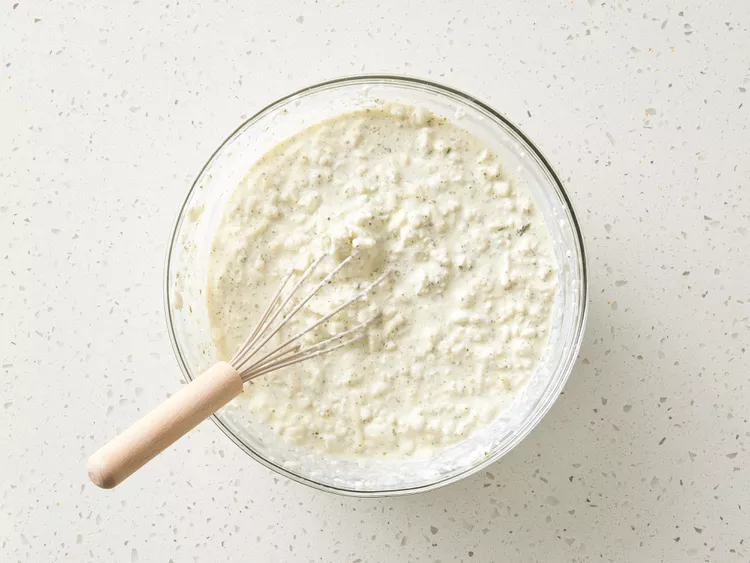3. Млечна смес: Смесете изварата с 1 чаша настърган кашкавал, яйцата, половината пармезан, риган/магданоз и малко черен пипер.