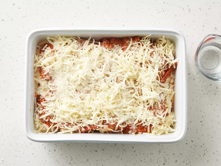 • Завършете с кори, останалия сос, настъргана моцарела и кашкавал, поръсете с останалия пармезан.
