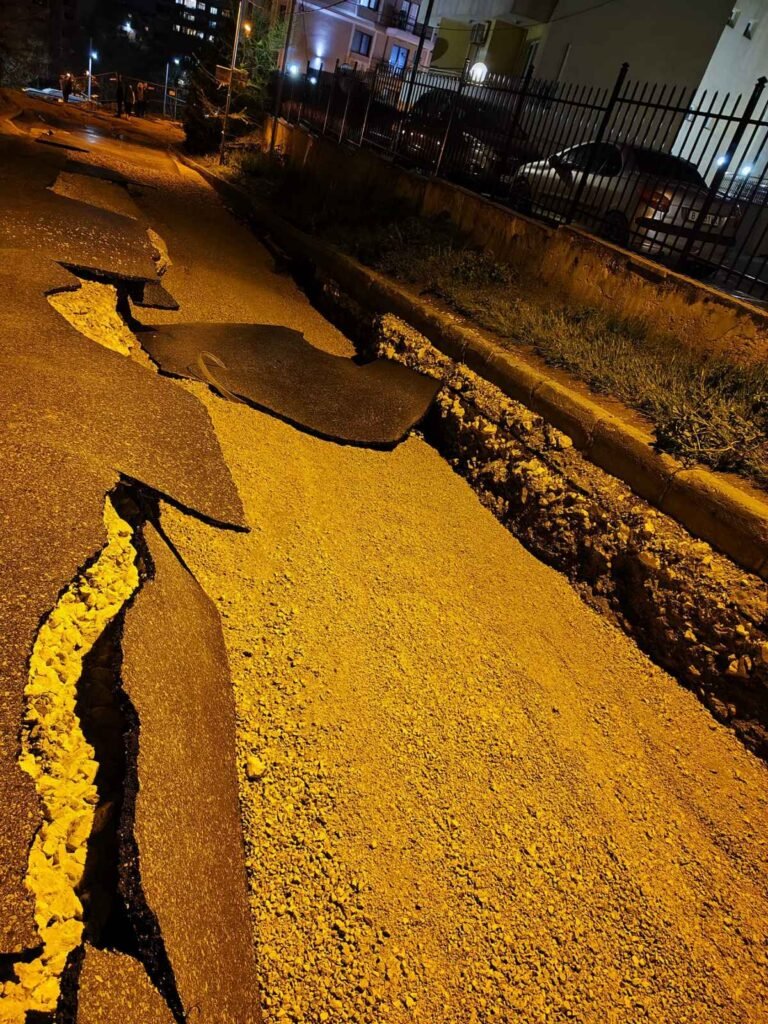 Земята по улицата се е разцепила досущ като при страшно земетресение и на мястото в момента зее огромна пропаст, в която като в капан са попаднали автомобили.