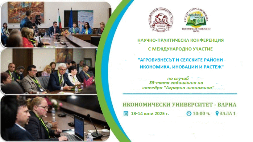 Научно-практическа конференция с международно участие на тема „Агробизнесът и селските райони – икономика, иновации и растеж“ ще се открие на 13 юни 2025 г. от 10:00 ч. в зала 1 и дистанционно. Форумът е посветен на 35-годишнината от основаването на катедра „Аграрна икономика“ и цели да събере известни учени и практици от страната и чужбина, представители на академичните среди, бизнеса, държавната администрация и неправителствени организации, ангажирани с аграрния сектор.