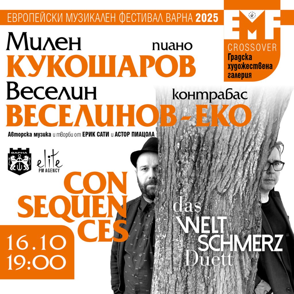 Популярните български джазмени Милен Кукошаров и Веселин Веселинов – Еко излизат утре на сцената на Европейския музикален фестивал Варна 2025 със своя кросоувър проект “Consequences”. Концертът им е на 16 октомври, четвъртък, в Градската художествена галерия.
