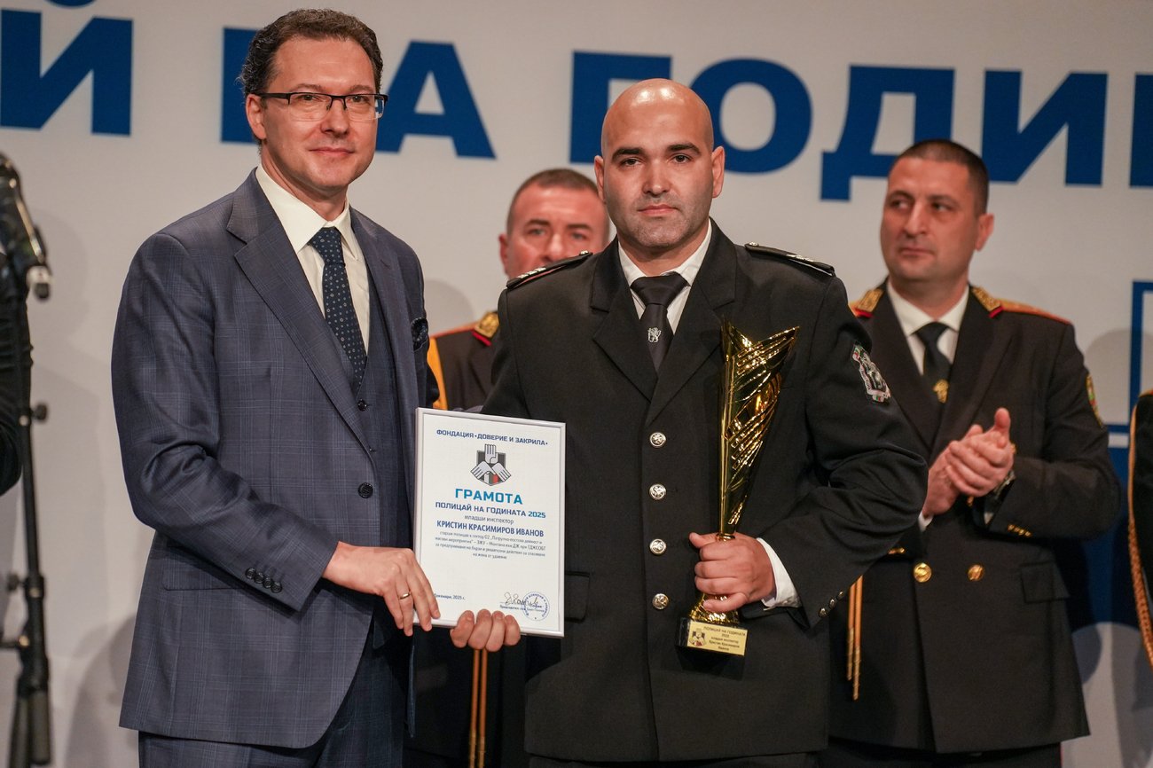 Пет колективни награди, пет индивидуални отличия и три номинации за граждански принос към работата на полицията бяха връчени в конкурса „Полицай на годината 2025“. Министър Митов благодари за дългогодишното партньорство на фондация „Доверие и закрила“, която заедно с Главна дирекция „Национална полиция“ организира за 32-ри път церемонията, замислена да насърчи значимите резултати в противодействието на престъпността, опазването на обществения ред и сигурността на хората.