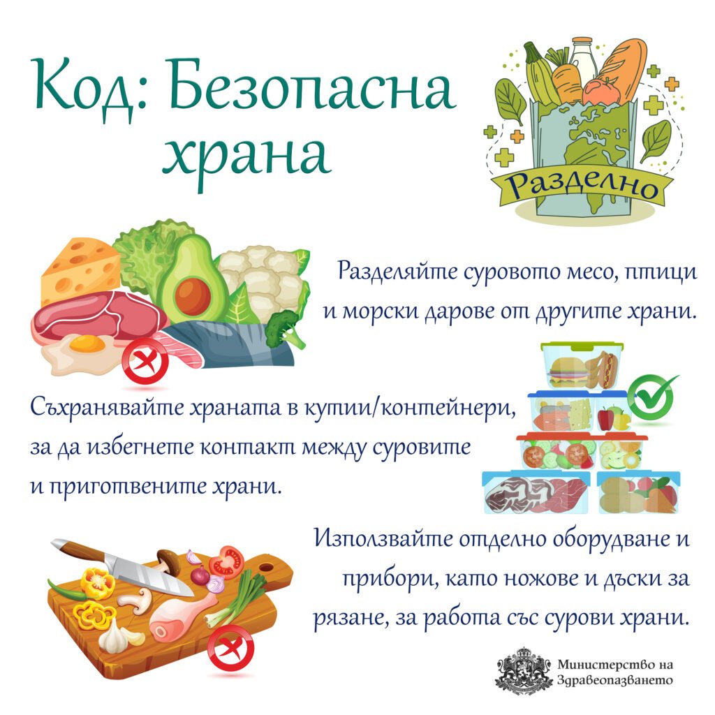 - Не смесвайте сурова и сготвена храна. Суровата храна, особено месото, птиците и морските дарове, както и техните сокове, могат да съдържат опасни микроорганизми, които могат да бъдат пренесени върху други храни по време на приготвянето и съхранението на храната.