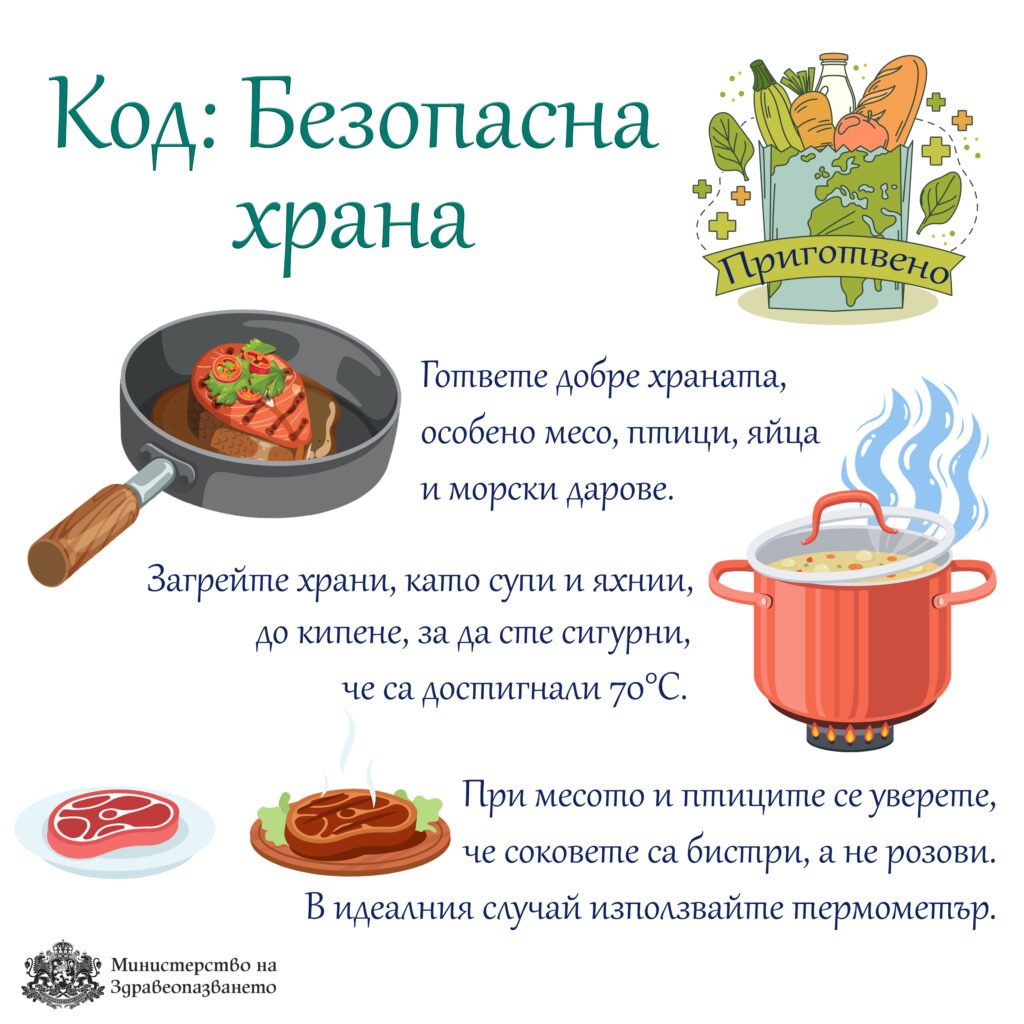 - Правилното готвене убива почти всички опасни микроорганизми. Храната е безопасно сготвена, когато вътрешната температура стане достатъчно висока, за да убие микробите, които могат да ви разболеят. Проучванията показват, че готвенето на храна до температура от 70°C може да помогне да се гарантира, че е безопасна за консумация. Храните, които изискват специално внимание, включват кайма, печени меса, големи парчета месо и цели птици.
