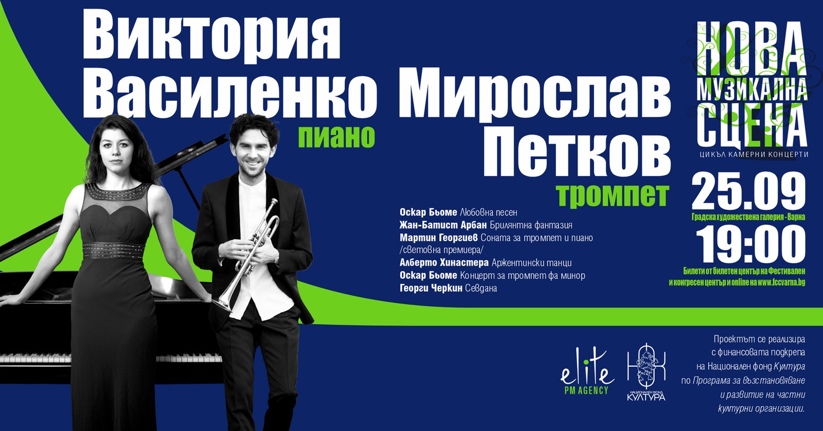 На 25 септември в Градската художествена галерия на Варна е концертът на един от най-талантливите и виртуозни съвременни тромпетисти – варненеца Мирослав Петков. Събитието е ярък акцент в програмата на проекта „Нова музикална сцена“. Публиката на морсикя град ще има удоволствието да чуе уважавания първи тромпетист на Royal Concertgebouw Orchestra, Амстердам, в тандем с блестящата пианистка Виктория Василенко – едно от открояващите се млади имена на клавирното изкуство на съвременния български и международен концертен подиум. Въпреки че не свирят за първи път заедно, двамата утвърдени изпълнители ще направят своя съвместен варненски дебют, за който са подготвили интригуваща програма с творби от Оскар Бьоме, Жан-Батист Арбан, Алберто Хинастера, Георги Черкин.