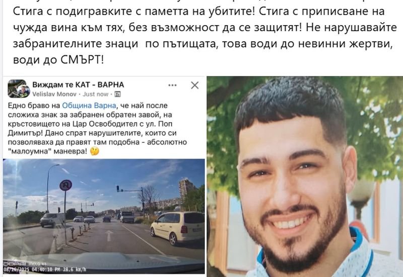 “Малка победа! След мое предложение към Община Варна на редовната комисия по безопасност на движението на 12.08.25г. днес 26.08.25г. сложиха забранителен знак за забранен обратен завой на кръстовището на бул. “Цар Освободител” и ул. “Поп Димитър”, където убиха единственото ми слънчево и вечно усмихнато дете-синът ми Александър П. Маринов-Алекс на 25г.