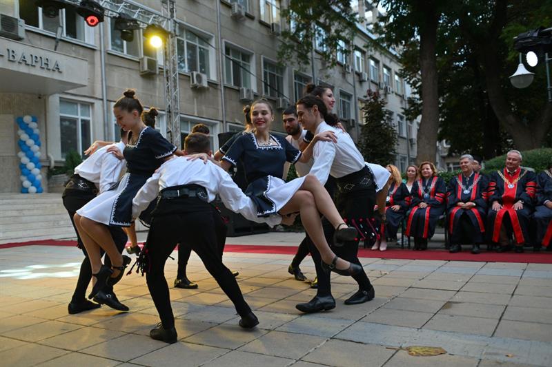 Към пожеланията за успешна нова академична година се присъединиха също студентите от първи и трети курс от англоезичните специалности в МУ-Варна Мартин Ивов и Моника Станчев. В празничната програма участваха пеещите таланти на МУ-Варна Виктория Гаджемова и Алън Паулсън, студентската група за индийски танци в състав Анрия Ананд, Нимиша Реджи, Елейна Фраю и Ния Томас, танцьорите от СТС „Диана“. По традиция финалът на тържественото откриване бе с право хоро, в което се включиха преподаватели и студенти.