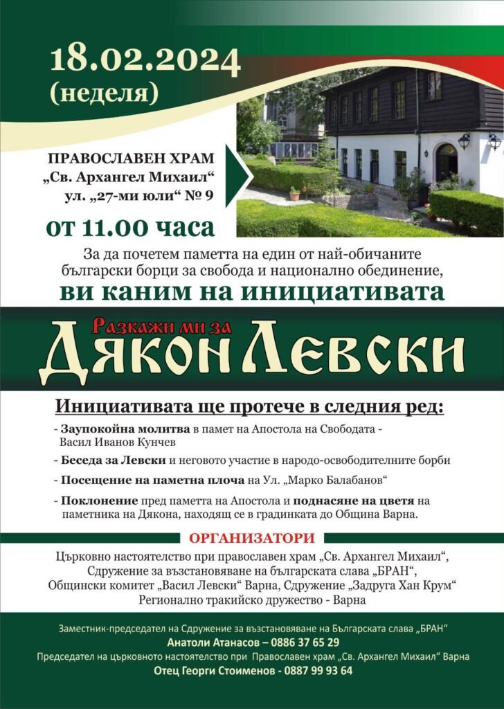 На 18-ти февруари от 11.00 часа в православен храм „Св.Архангел Михаил“ ще се проведе родолюбивото мероприятие под надслов „Разкажи ми за Дякон Левски“, предаде TheSite24. Събитието е във връзка с почитане паметта на обичания син на Майка България Васил Иванов Кунчев, по – известен като Дякон Левски. Мероприятието е във връзка с изпълване на 151 години от обесването на Апостола на Свободата, а организатори на събитието са колективния член на Областната организация на Съюза на офицерите и сержантите от запаса и резерва Варна – Сдружение за възстановяване на българската слава „БРАН“, Сдружение „Задругата Хан Крум“, Общински комитет – Варна към Общобългарски комитет „Васил Левски“ и църковното настоятелство при православен храм „Св. Архангел Михаил“ Варна и с подкрепата на Регионално тракийско дружество Варна. Самото събитие ще започне с отслужване на заупокойна света литургия в памет на Левски и ще продължи с беседа за неговото житие и отдадеността му към делото за освобождение на България, посещение на паметна плоча на мястото, където е отседнал при посещението си във Варна през месец декември 1868 година и поднасяне на цветя и венци на паметника, находящ се в градинката пред Археологически музей Варна и до Община Варна.