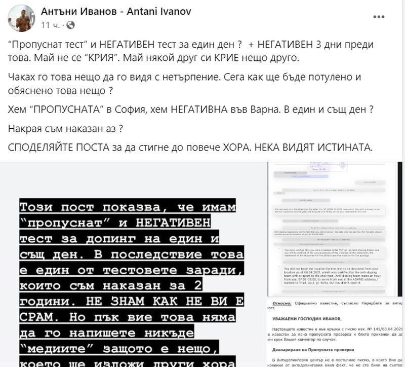 Доказателство, че имам отрицателен и пропуснат тест в един и същи ден в 2 различни града. WADA е позор. Не можете да баннете някого за 2 години, когато има отрицателен тест в същия ден с пропуснат тест. Общността на спортистите ще хареса това“, написа Иванов.