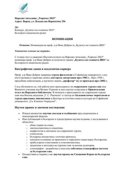 Народно читалище “Тюркоаз 2025” изпраща номинация на проф. д-р Иван Добрев за конкурса “Будител на годината 2025” на БНР, съобщиха за СайтЪТ от ръководството на читалището.