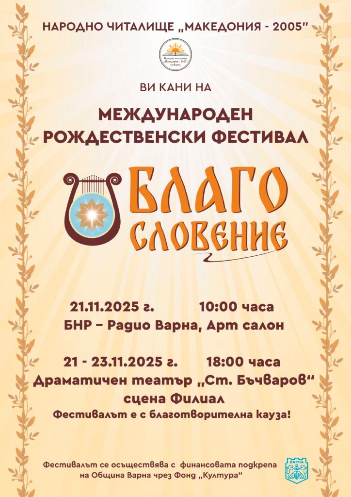 Международният Рождественски фестивал “Благословение” ,,ПРИЗВАНИЕТО“ – със Слово, Музика и Танц в света на изкуството: духовно начало за човека! по традиция ще бъде открит на 21.11.2025 г. от 10:00 часа в АРТ салона на БНР-Радио Варна с представянето на българо – английския алманах „Брегове“ с любезното съдействие на Станислав Пенев и членовете от Сдружение Литературно Общество (СЛОВ) – Варна.